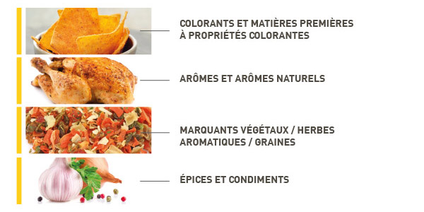 Arômes naturels, colorants, épices, champignons, herbes aromatiques, légumes, condiments, graines, fruits… la variété de notre gamme permet de développer une palette quasi infinie de décors et de saveurs. La solution idéale pour apporter du goût, du visuel, de la couleur sur des supports neutres (pâtes, riz, couscous, pâte à pain…).
